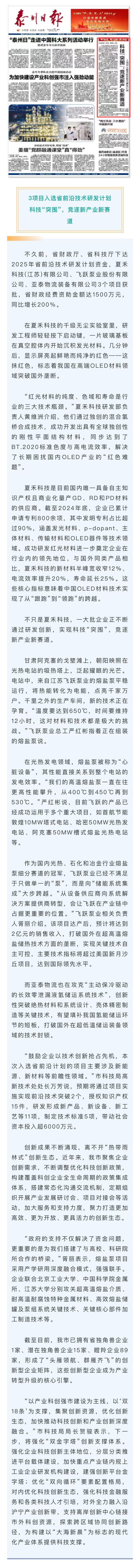 《泰州日报》头版 | 我市3项目入选省前沿技术研发计划